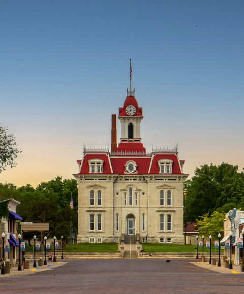 Completed in 1873, the Courthouse was built from native limestone quarried and hand-cut in the Flint Hills. The limestone blocks were brought to the Courthouse by horse-drawn wagons; some stones weighed nearly seven tons. Over 150 years later, the Courthouse is unmatched in durability and design and remains a living tribute to its builders and the Flint Hills pioneers.